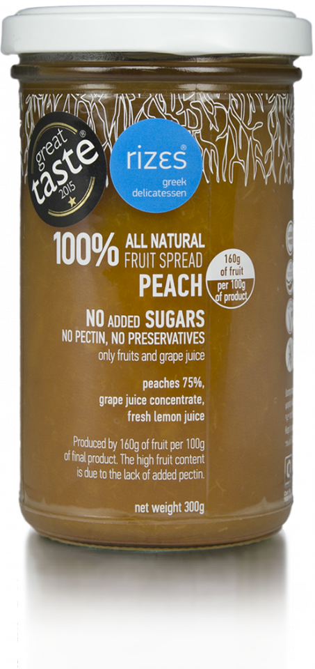 Mashed peaches simmer in concentrated grape juice and fresh lemon juice. It is a spread with a velvety texture, intense aroma and the rich fruity taste of peach.